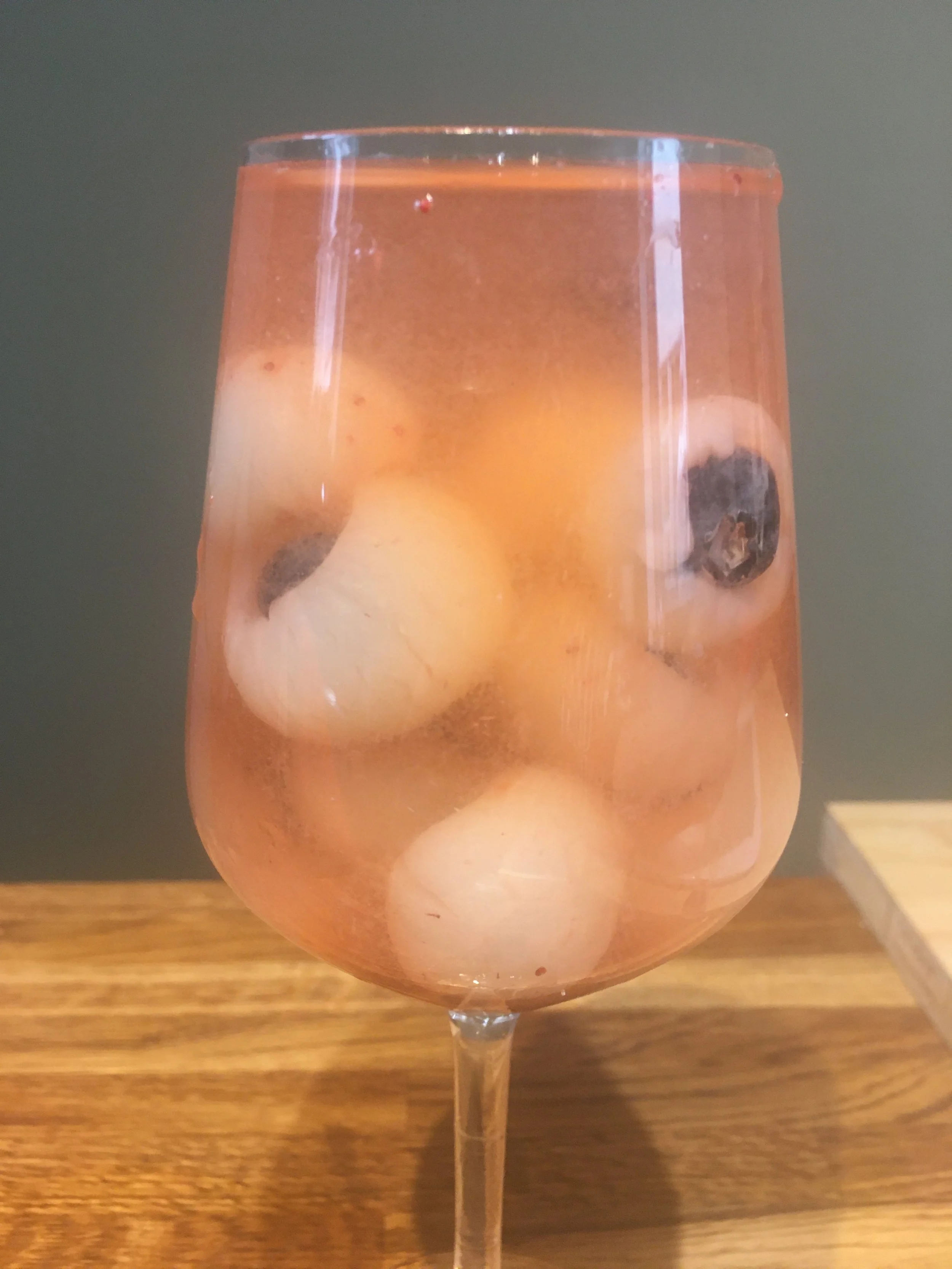 Place blueberries in to the eyes of the lychees, maybe add some jam or raspberries to make them look a bit blood shot. ! Can put them back in the lychee juice or berry cordial?