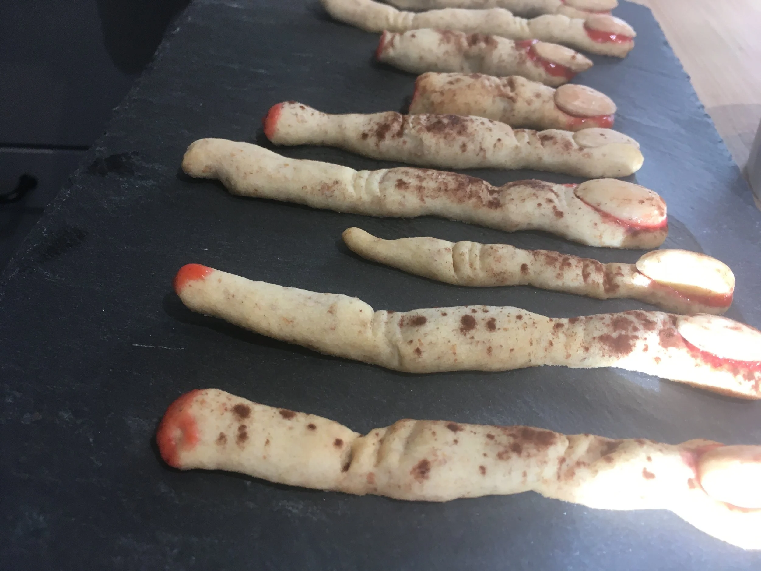 Divide in to pieces and roll in little sausages, cut to a finger size, and use the tip of a spoon to make the knuckle creases. Add an almond to make a nail., (you can put some red jam around it too ;-)